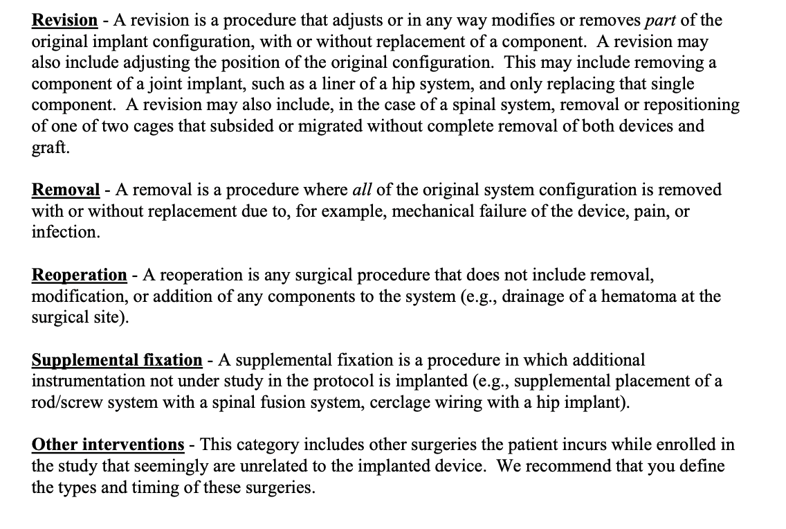A revision involves changing part of the system; a removal involves taking out all of it. The guidance notes that not every removal automatically constitutes a failure — removing a pedicle screw system after confirmed fusion is different from removing a cage due to pseudoarthrosis. Sponsors need to pre-specify in their protocol which removals will be treated as failures and provide a rationale. If the protocol calls for planned removal of any component, how that will be interpreted in terms of study success or failure needs to be defined before enrollment begins.